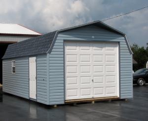 This garage has 6 ft. tall side walls and a barn style roof. This roof style allows the installation of 8 ft. tall garage doors to accommodate larger vehicles. It is available in sizes ranging from 12x16 to 14x36 and comes standard with a 9' x 7' garage door, a 36" man door and 2 small windows. A loft can be added for additional storage.
